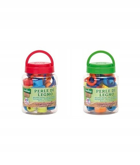 Dziecko wsuwa duże drewniane koraliki o różnych kształtach na sznurki, doskonali w ten sposób swoje umiejętności psychomotoryczne, elastyczność dłoni i koncentrację. Koraliki mają różne kształty i kolory, aby pomóc maluchowi nauczyć się wyboru kolorów i kształtów.