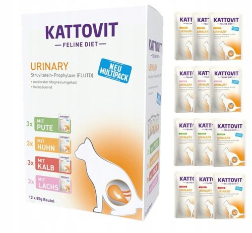 Kattovit Feline Diet Urinary to karma stworzona specjalnie dla kotów cierpiących na choroby dolnych dróg moczowych. Często występującym symptomem choroby jest FLUTD (Feline Lower Urinary Tract Disease), często prowadzący do powstawania struwitów, a w konsekwencji do wtórnych chorób nerek. Obniżona ilość magnezu w karmie może obniżyć także ilość magnezu w moczu i w ten sposób zapobiegać powstawaniu kamieni moczowych. Kattovit URINARY zawiera substancje zakwaszające mocz (DL-metionina i siarczan wapnia), w celu obniżenia jego poziomu pH.