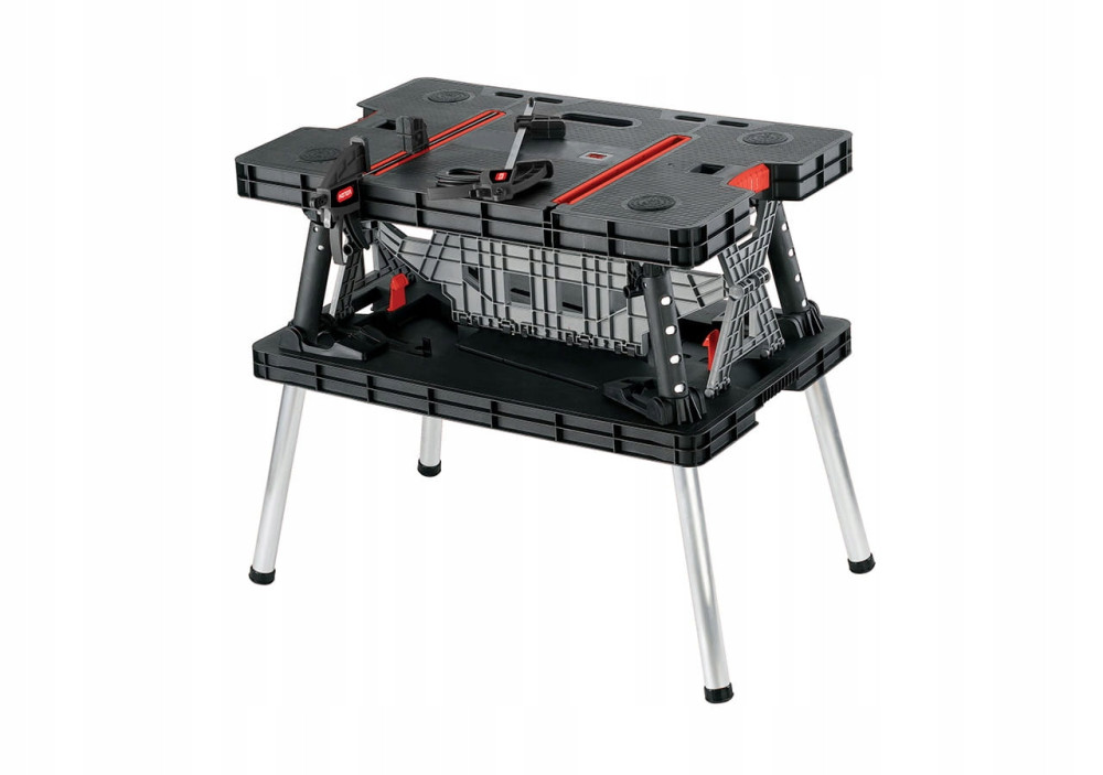 Praktyczny i wszechstronny stół warsztatowy, przystosowany do pracy w różnych warunkach. Jego uniwersalna, przenośna konstrukcja wyposażona jest w system umożliwiający szybkie rozłożenie i złożenie, co sprawia, że jest idealnym wyborem dla majsterkowiczów i profesjonalistów. Duża przestrzeń robocza stołu, mierząca 550 mm x 840 mm, i wytrzymałość do 453 kg/1000 lbs pozwalają na realizację nawet najbardziej zaawansowanych prac.