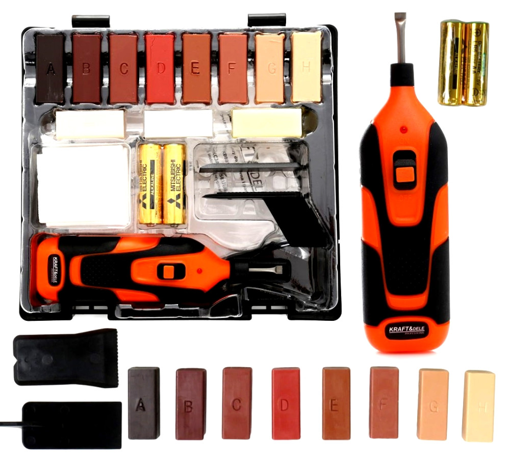 Zestaw do naprawy drewnianych powierzchni, dzięki niemu łatwo i szybko można naprawić parkiet, powierzchnie z korka, drewna, laminatu i sztucznego tworzywa przez użycie odpowiedniego wosku.