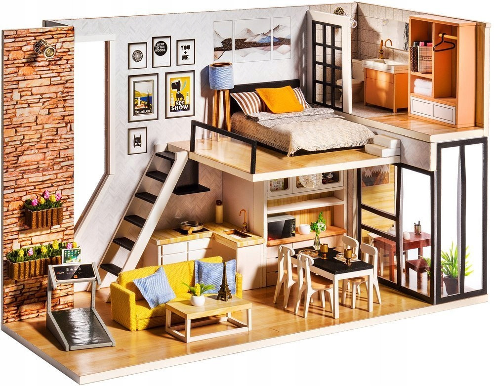 Doskonale odwzorowana miniatura piętrowego apartamentu, który został urządzony w nowoczesnym stylu. Na niższym poziomie zaplanowano kuchnię, jadalnię oraz miejsce do relaksu, natomiast schody prowadzą do sypialni i łazienki na piętrze.