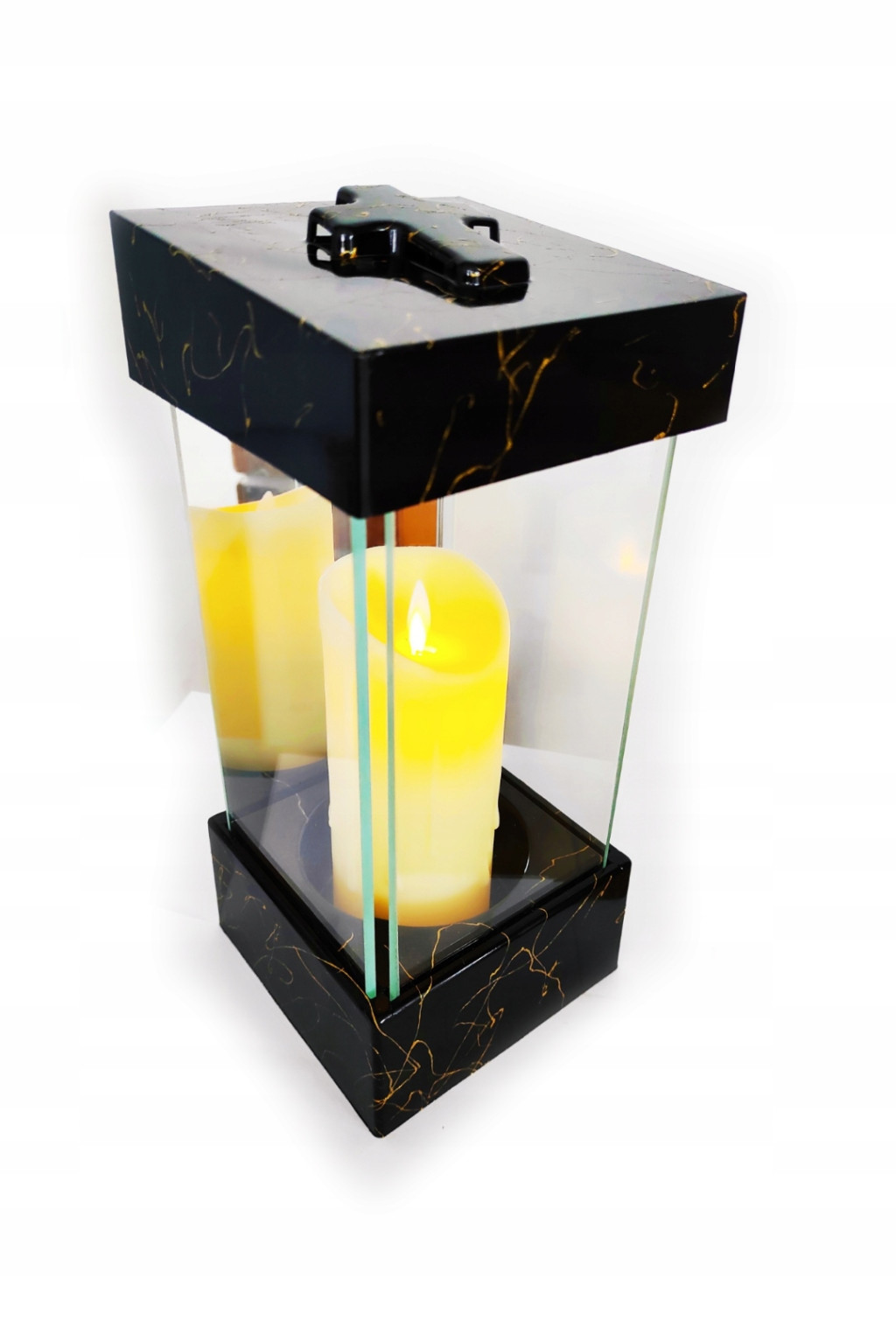 Na pokrywie znajduje się ozdobny krzyż z pod którego wydobywa się światło świecy nadając lampionowi dodatkowego uroku.