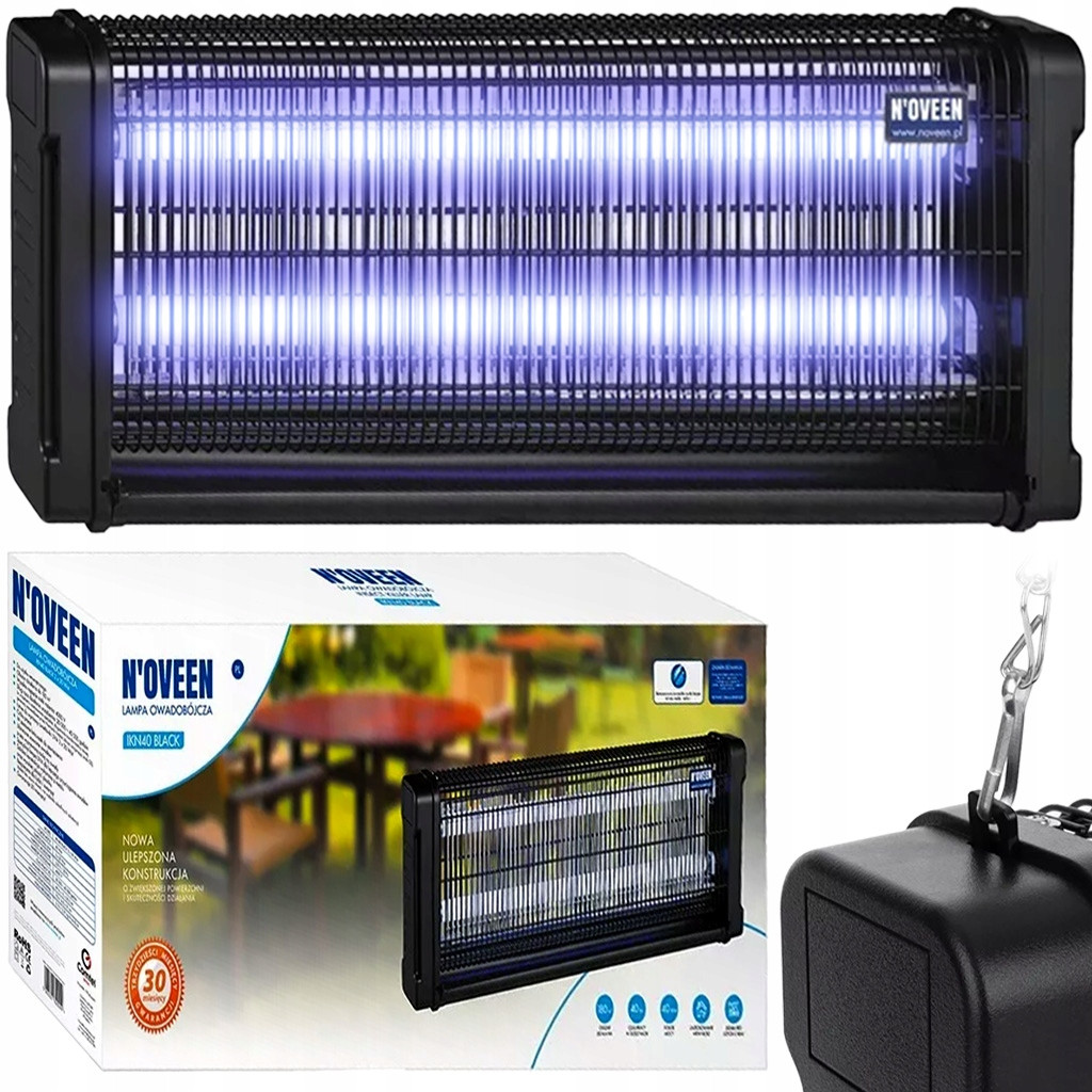 Lampa owadobójcza IKN40 Black 2x20 Wat marki N'oveen to pułapka o mocy 40 W, generująca napięcie wyjściowe 4000 V, o powierzchni roboczej 180 m². Zasilana jest dwiema świetlówkami UVA 2 x 20 W. Jest to idealny wybór do zwalczania owadów latających takich jak komary, muchy i ocetniki.