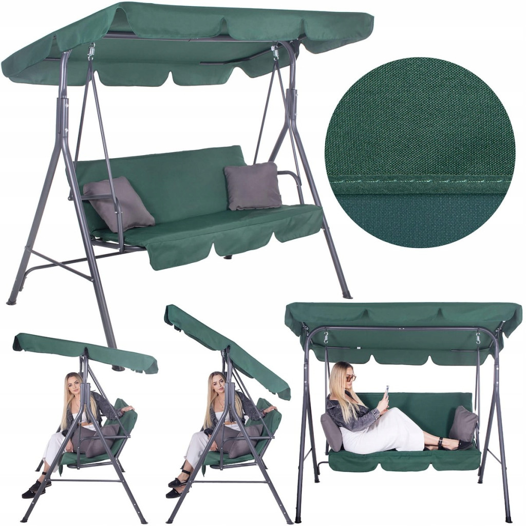 Dodatkowo jest okryta daszkiem odpornym na UV który chroni w deszczowe dni i ochładza w upały. Pokrycie zostało wykonane z poliestru o gramaturze 140 g/m². Huśtawka jest łatwa w czyszczeniu i solidna w konstrukcji. Posiada stalowy stelaż i wzmocnione sprężyny. Utrzyma ciężar 3 dorosłych osób (udźwig do 200 kg).