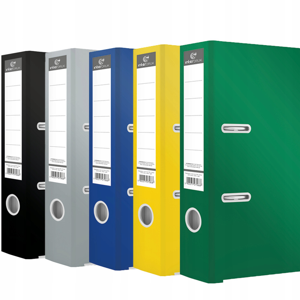 Zestaw 5 X Segregator biurowy RÓŻNE KOLORY na dokumenty w formacie A4 z oklejony z zewnątrz kolorową folią, w środku wyklejony białym papierem.