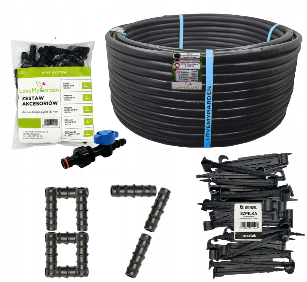 W naszym zestawie znajdziesz niezbędne elementy do efektywnego nawadniania Twojego ogrodu. Z dumą prezentujemy linię kroplującą o długości 100m, średnicy 16mm i rozstawie kroplowników co 33cm.