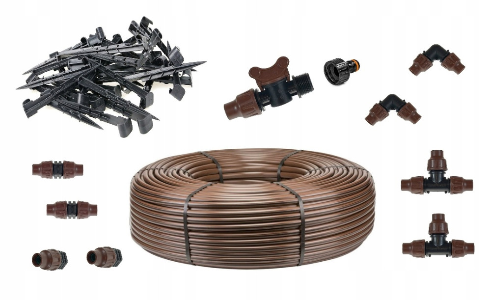 - linia kroplująca z KOMPENSACJĄ ciśnienia brązowa 16mm 25m długości z kroplownikiem co 33cm z wydatkiem wody 2,0l/h z emitera