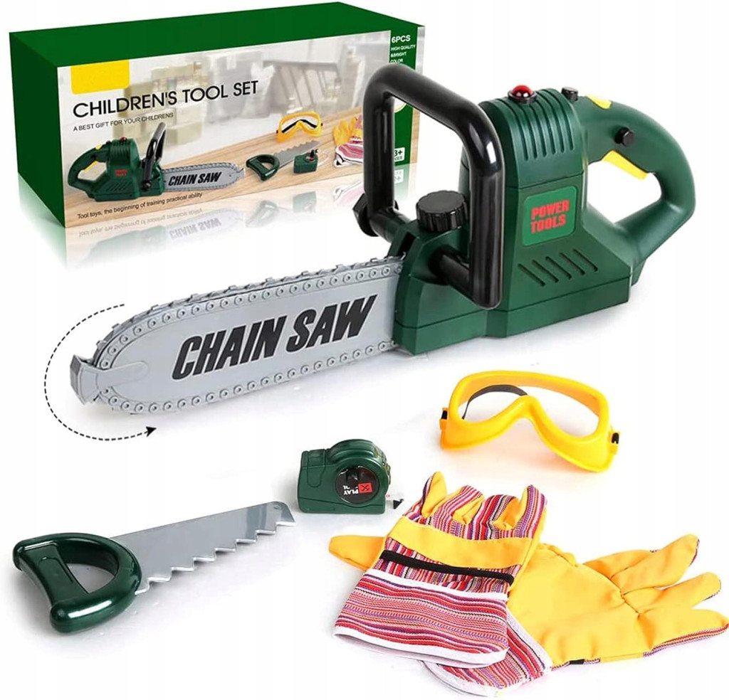 ✔️ Duży zestaw: różnorodne akcesoria pozwalające na kreatywną zabawę: 1 x zabawkowa piła łańcuchowa, 1 x gogle, 1 x miarkę, 1 x piłę i parę rękawic.