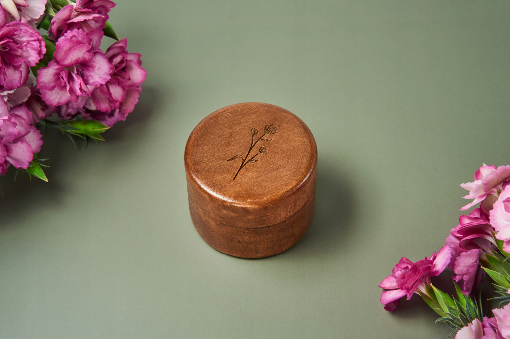 „Opalenizna” na pudełeczku to zasługa bejcowania. Każde pudełeczko z tym wykończeniem przechodzi przez proces barwienia oraz lakierowania, dzięki któremu odcień staje się nad wyraz głęboki i nasycony. Bejcowanie sprawia też, że wygrawerowany wzór jest delikatnym, drugoplanowym dodatkiem lepiej widocznym dopiero pod odpowiednim kątem.