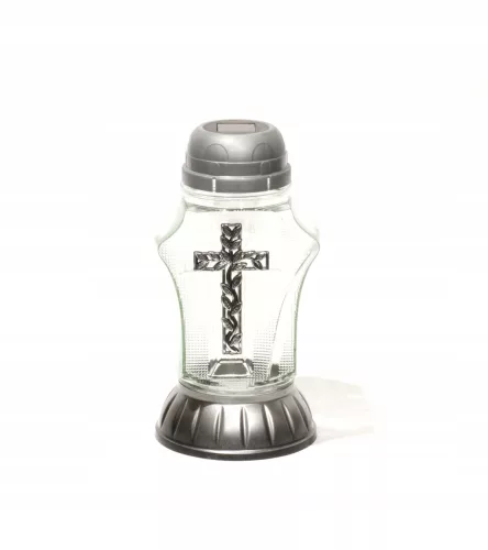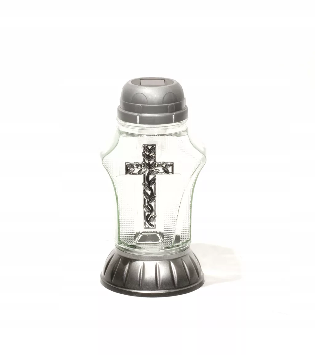 Dziś do sprzedania znicz szklany S-91 , przezroczysty z zaznaczonym srebrnym dekoracyjnym krzyżem z kapturkiem solarnym w kolorze srebrnym. Znicz na dekoracyjnej podstawie z pasującym deklem o łącznej wysokości 21 cm. W deklu umieszczona bateria słoneczna oraz dioda LED w kolorze białym z czujnikiem zmierzchu.
