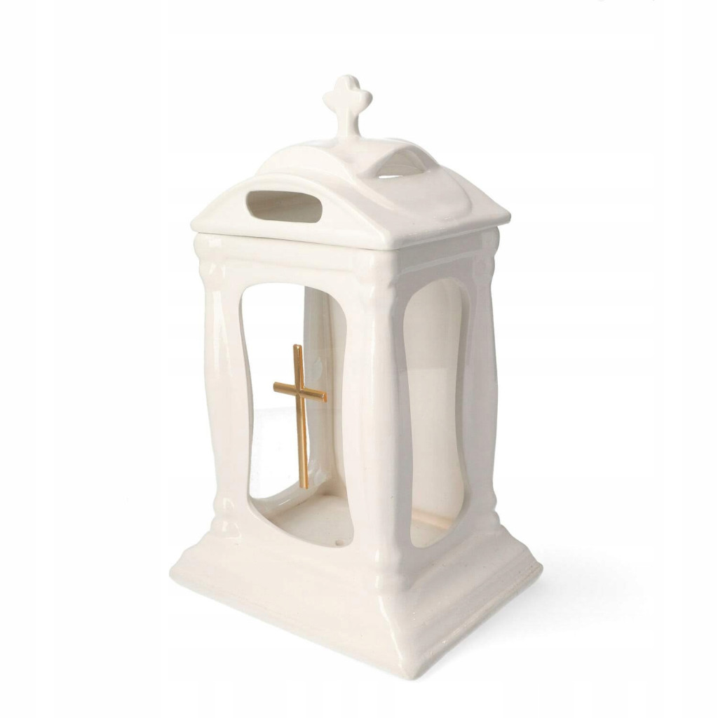 Znicz Kapliczka Ceramiczna Biała to elegancki i symboliczny sposób na uczczenie pamięci bliskich. Wykonany z białej ceramiki pokrytej błyszczącą glazurą, która nadaje jej głębię i elegancję, prezentuje się niezwykle dostojnie i subtelnie. Jego klasyczny kształt kapliczki z dwuspadowym daszkiem przywodzi na myśl spokój i ukojenie. Z przodu i po bokach znicza znajdują się szklane okienka, które chronią płomień świecy przed wiatrem, a jednocześnie pozwalają na piękne rozproszenie światła. Na froncie kapliczki widnieje złoty krzyż, który dodaje mu duchowego wymiaru i podkreśla jego symboliczne znaczenie.