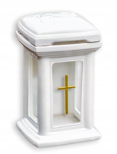 Znicz Kapliczka Ceramiczna Biała z Krzyżem to elegancki i symboliczny sposób na uczczenie pamięci bliskich. Wykonany z białej ceramiki pokrytej delikatną glazurą, która nadaje jej subtelny połysk i chroni przed uszkodzeniami, prezentuje się niezwykle dostojnie i subtelnie. Z przodu i po bokach znajdują się szklane okienka, które chronią płomień świecy przed wiatrem, a jednocześnie pozwalają na piękne rozproszenie światła. Złoty krzyż, umieszczony na froncie znicza, dodaje mu duchowego wymiaru i podkreśla jego symboliczne znaczenie.