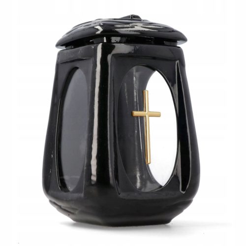Znicz Kapliczka Ceramiczna Czarna z Złotym Krzyżem to elegancki i symboliczny sposób na uczczenie pamięci bliskich. Wykonany z czarnej ceramiki pokrytej błyszczącą glazurą, prezentuje się niezwykle dostojnie i subtelnie. Jego oryginalny kształt, rozszerzający się ku dołowi, nadaje mu stabilności i wyjątkowego charakteru. Z przodu i po bokach znajdują się szklane okienka, które nie tylko umożliwiają obserwację migoczącego płomienia, ale również dodają zniczowi lekkości i elegancji.
