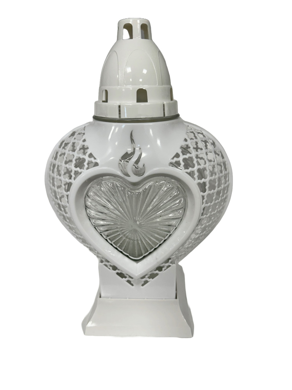 Znicz wykonany z plastiku i szkła w kształcie serca.