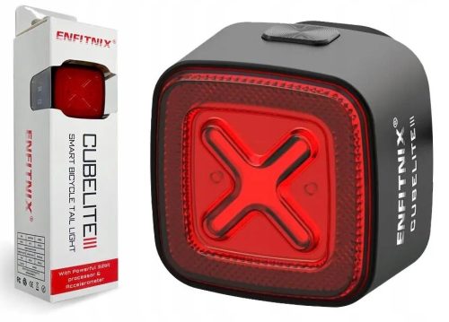 Bardzo lekka, zaawansowana technologicznie tylna lampka LED-owa CUBELITE III, godny następca bardzo popularnego modelu II, 32 bitowy procesor odpowiadający za analizę danych drgań i przeciążeń, akcelerometr, żyroskop, czujnik światła (dostosowuje moc świecenia), czujnik grawitacyjny, czujnik wibracyjny, tryb manualny i automatyczny, wskaźnik słabej baterii, odporność na wodę IPX6, ładowanie przez gniazdo USB-C, od 9 do 30h na jednym ładowaniu, widoczność z 200 metrów. Mocowanie podsiodłowe i na sztyce (dwa mocowania w jednym zestawie).