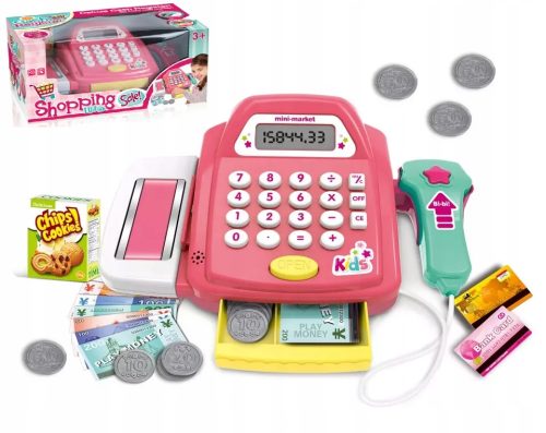 Elektroniczna kasa fiskalna w bardzo przyjemnej różowo-miętowej kolorystyce. Kasa posiada kalkulatorek z miękkimi przyciskami. U większości dzieci zabawa w sklep i sprzedawcę jest jedną z uwielbianych zabaw. Na kalkulatorze można oczywiście dodawać, odejmować, mnożyć, dzielić, sumować - także przy okazji zabawy dzieci również się uczą. Dodatkowo produkt został wyposażony w dźwięk - który znajduje się zarówno w przyciskach jak i skanerze produktów, co pozwala na profesjonalną obsługę klienta. Szufladka kasy jest otwierana, kasa wyposażona również w "czytnik" kart kredytowych oraz taśmę do przesuwania produktów, do zestawu dołączono różne akcesoria niezbędne do zabawy w "sklep".