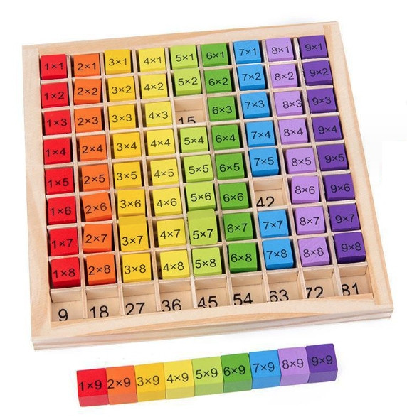 Zestaw tabliczki mnożenia został w całości wykonany z drewna i pomalowany bezpiecznymi farbami w żywej, przyciągającej uwagę kolorystyce.