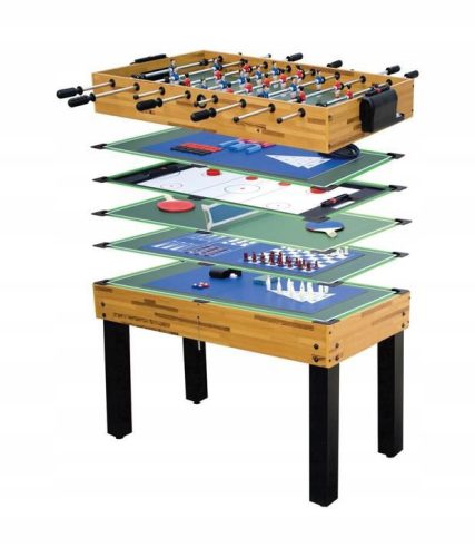 Wysokiej jakości duży stół do gier zapewniający masę rozrywki dla każdego gracza. Wyposażony został w demontowane blaty umożliwiając grę w aż 12 niepowtarzalnych rozgrywek. Oprócz podstawowych piłkarzyków , cymbergaja i bilarda znajdziemy tu również ping pong , kręgle, szachy, warcaby i wiele innych
