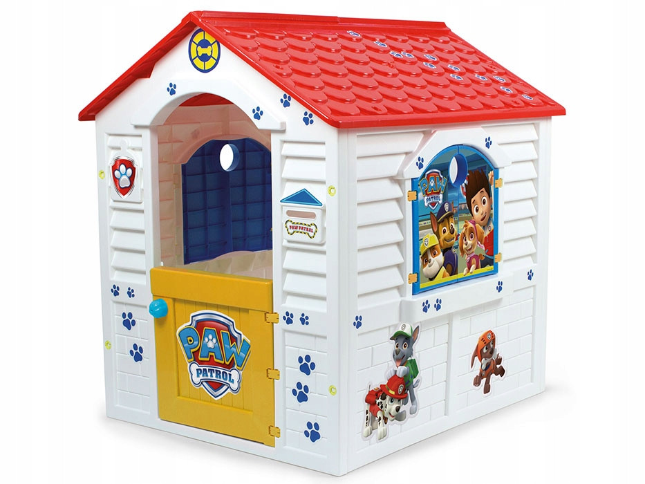 Domek Psi Patrol 89526. Domek w kolorze białym, na którym zauważamy charakterystyczne ślady psich łapek w kolorze niebieskim, a także wesołe szczenięta. Dach w kolorze czerwonym, z widocznymi elementami dachówek i kilkoma śladami łapek. Domek posiada połówkowe drzwi wejściowe w kolorze żółtym, z logo Psiego Patrolu, z niebieską okrągłą klamką. Na ścianie przy drzwiach, zauważamy skrzynkę na listy oraz imitację dzwonka. Otwierane, niebieskie okiennice z otworem u góry, który dodatkowo doświetla wnętrze, gdy okna są zamknięte. Okna od zewnątrz pokryte zostały kolorowym nadrukiem, przedstawiającym pieski i Rydera.