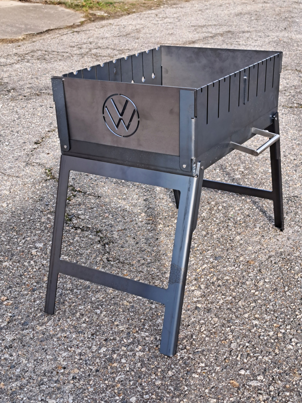 Składany grill, kompaktowy, w formie walizki — idealny na wyjazdy plenerowe. Wykonany ze stali walcowanej na gorąco o grubości 3 mm, co gwarantuje trwałość i wytrzymałość. Łatwy do złożenia i zajmuje niewiele miejsca.