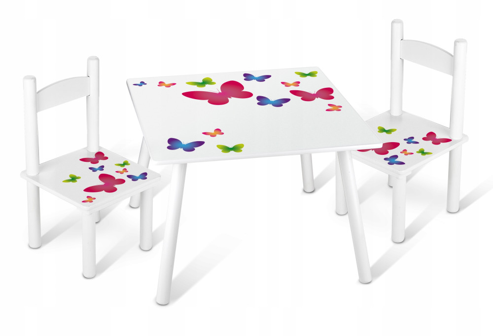 Stolik w zestawie z dwoma krzesełkami ze wzorem kolorowych motyli.