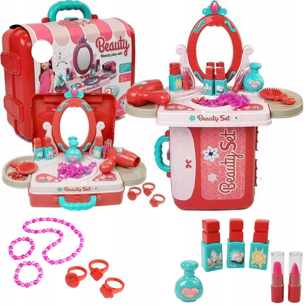Dziewczęcy zestaw piękności w formie uroczej walizeczki jest bardzo poręczną, a przede wszystkim wygodną zabawką. Konstrukcja walizki posiada rączkę, co sprawia, że modnisia może zabrać ją ze sobą, gdzie tylko zechce. Komplet akcesoriów makijażystki posiada przyciągający wzrok design i połączenie kolorystyczne. Jasnoróżowy blacik toaletki rewelacyjnie łączy się z ciemnoróżowymi i turkusowymi elementami. Zamiana różowo-turkusowej walizeczki w stolik dla makijażystki jest bardzo prosta.
