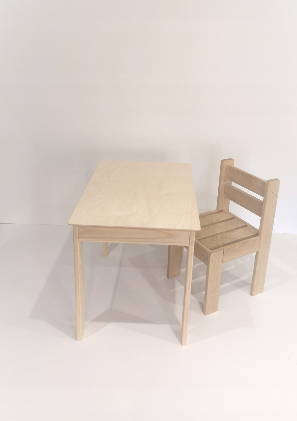 Krzesełko i stolik złożone metodą czopowania ,klejone i dodatkowo wzmocnione wkrętem .