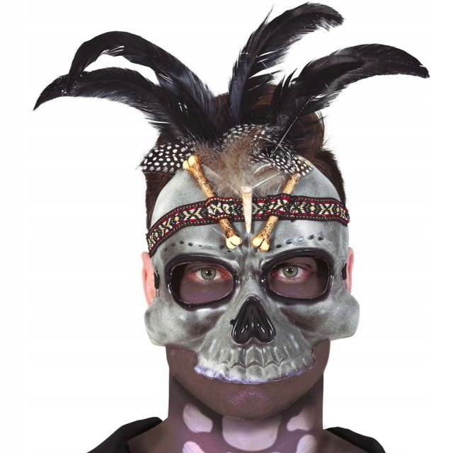 Maska szamana Voodoo to rewelacyjny pomysł na zupełną zmianę wizerunku podczas balu np. na Halloween. Maska wykonana z tworzywa sztucznego, bogato zdobiona trofeami w postaci piór i kości. Trofea umocowane są do maski za pomocą parcianego paska, z azteckim wzorem. Ogromne wrażenie robi wysunięta szczęka. Maska zakładana na gumkę.Do takiej maski , skompletowanie reszty kostiumu nie powinno stanowić problemu, gdyż to ona jest jegą główną częścią.
