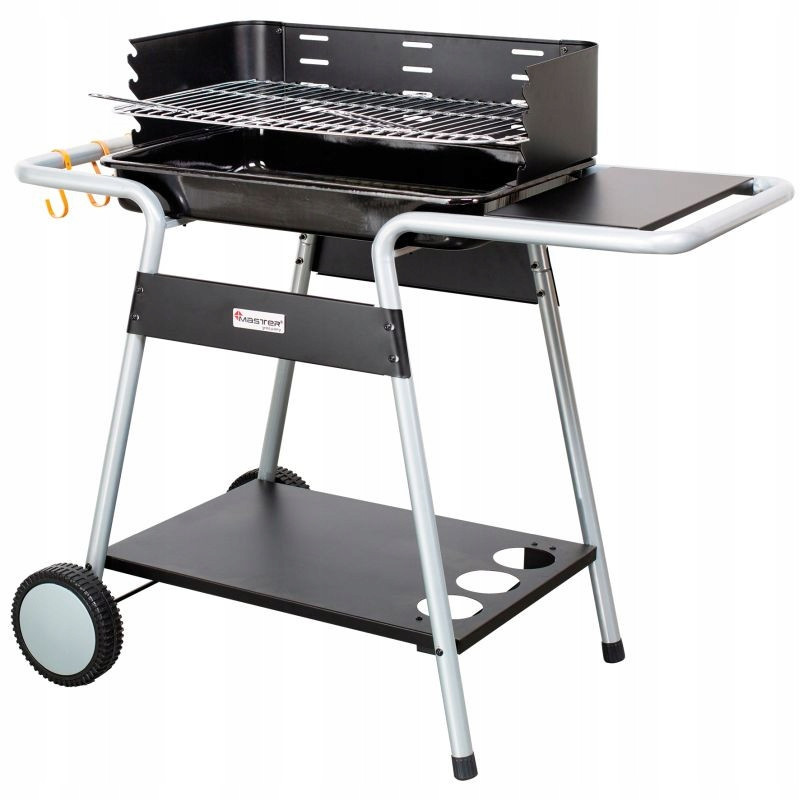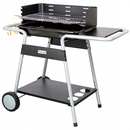 Wyposażenie: 2 kółka, boczna i dolna półka, haczyki na akcesoria grillowe.