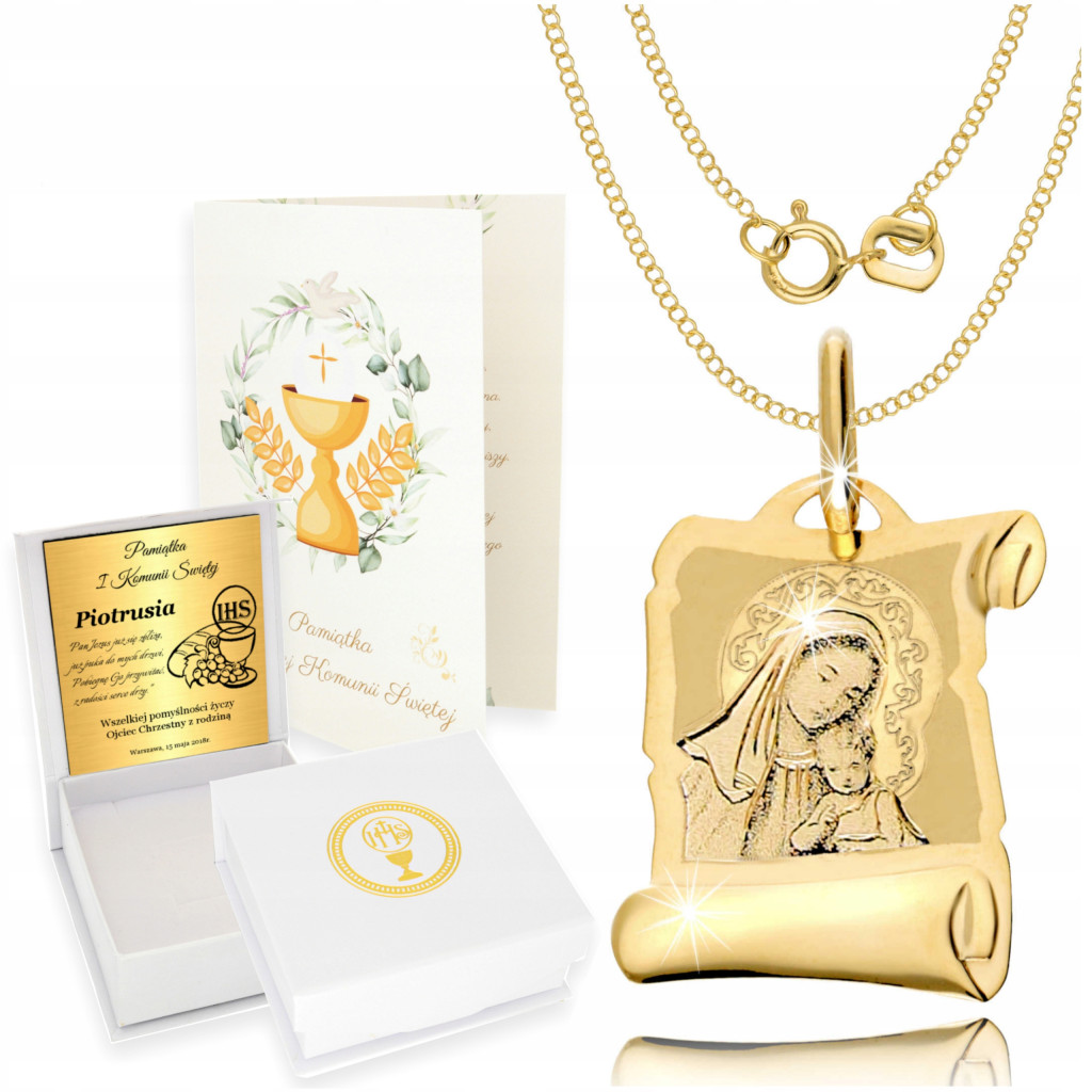 W przypadku zamówienia graweru na komunię, standardowo zapakujemy w pudełeczko komunijne oraz dodamy kartę Pamiątka Pierwszej Komunii Świętej - gratis