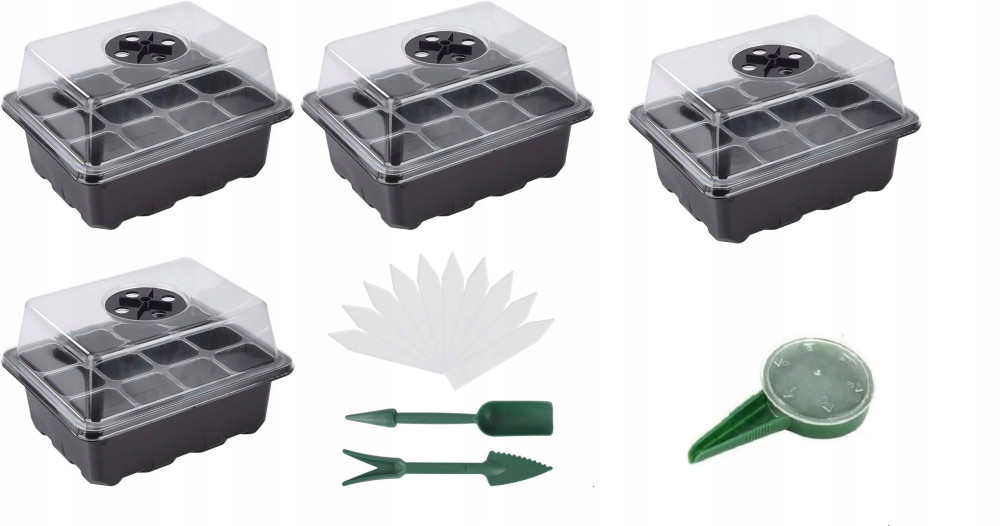 wynosi 19 x 14,5 x 11 cm, każda mała szklarnia ma 12 komórek. Otwory drenażowe na dnie zapobiegają wchłanianiu przez korzenie nadmiaru wody i są idealne do kiełkowania nasion.