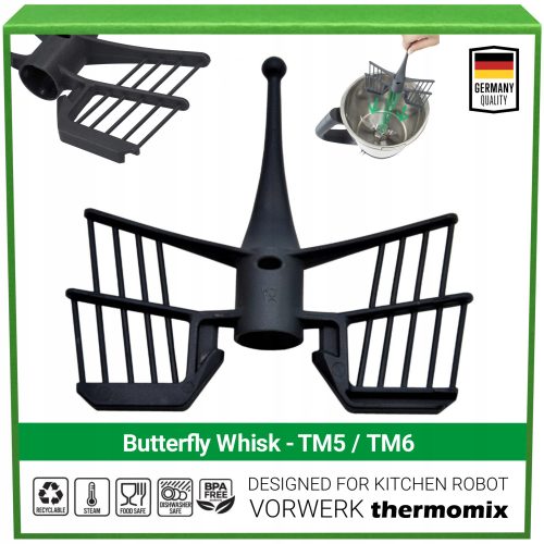 Motylek do VORWERK Thermomix TM6 i TM5 służy do ubijania śmietany lub białek. Świetnie sprawdza się także podczas przygotowywania mas kremowych i budyniowych. Zapewnia równomierne mieszanie wszystkich składników przy niskiej prędkości, dzięki czemu nie przywierają one do dna.