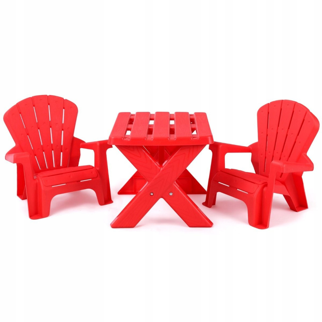 Komfortowe krzesła: 2 krzesła z podłokietnikami zapewniają dzieciom wygodę podczas siedzenia. Ergonomicznie wyprofilowane wysokie oparcie i szerokie, zakrzywione siedzisko doskonale dopasowują się do kształtu ciała, co sprawia, że siedzenie jest bardzo komfortowe. Konstrukcja z listew poprawia cyrkulację powietrza, zapewniając dzieciom uczucie chłodzenia nawet podczas gorących dni.