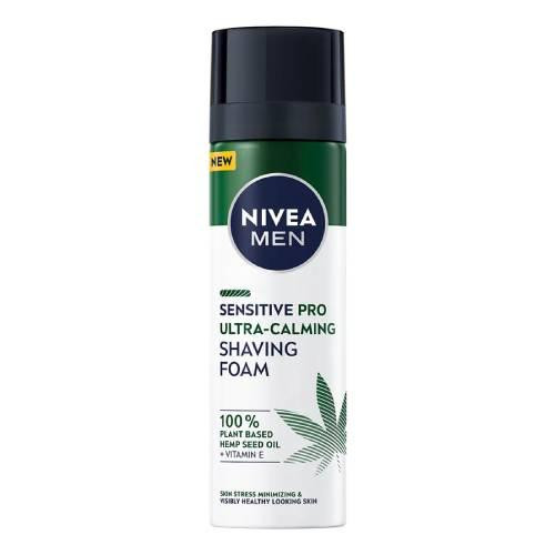 NIVEA MEN Sensitive Pro Ultra-łagodząca pianka do golenia natychmiast minimalizuje oznaki stresu skóry, takie jak suchość, podrażnienia. Gęsta formuła ze 100% roślinnym olejem z nasion konopi i witaminą E zmiękcza zarost i chroni skórę przed podrażnieniami po goleniu, zapewniając komfort i widocznie zdrowy wygląd skóry.