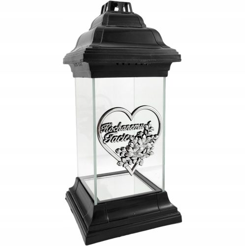 Kapliczka wykonana z grubego i bezbarwnego szkła. Na środku szyby znajduje się duże srebrne serce z dedykacją Kochanemu Tacie. Znicz jest ciężki, solidny, a szeroka podstawa zapewnia stabilność. Lampion posiada szeroki otwór na wkład o średnicy 7,5cm, dzięki czemu jest przystosowany do wielu rozmiarów wkładów parafinowych, olejowych oraz różnego rodzaju figurek oraz wkładów led.