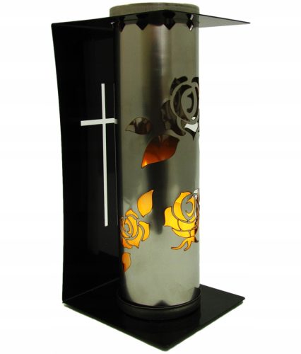 Wspaniały, nowoczesny znicz wykonany z metalu. Tuba z wyciętymi zdobieniami w kształcie kwiatów róży została wykonana z wysokojakościowej stali.