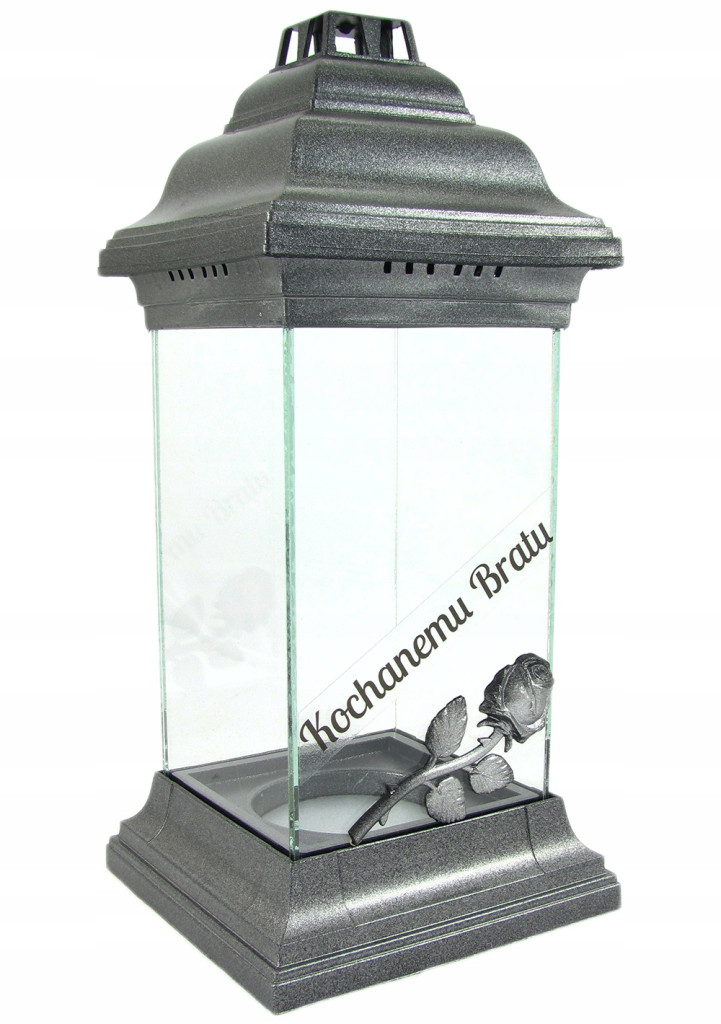 Pięknie wykonany znicz ze szkła bezbarwnego z napisem Kochanemu Bratu. Znicz jest ciężki, solidny, a szeroka podstawa zapewnia stabilność. Elementy plastikowe wykonane są z twardego plastiku odpornego na wysokie temperatury.