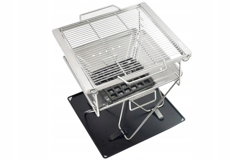 Cała konstrukcja grilla jest składana na płasko, posiada pełne ścianki przez co ogień nie jest rozpraszany przez wiatr. Całość jest odpowiednio wysoko nad ziemią na czterech stabilnych nogach.