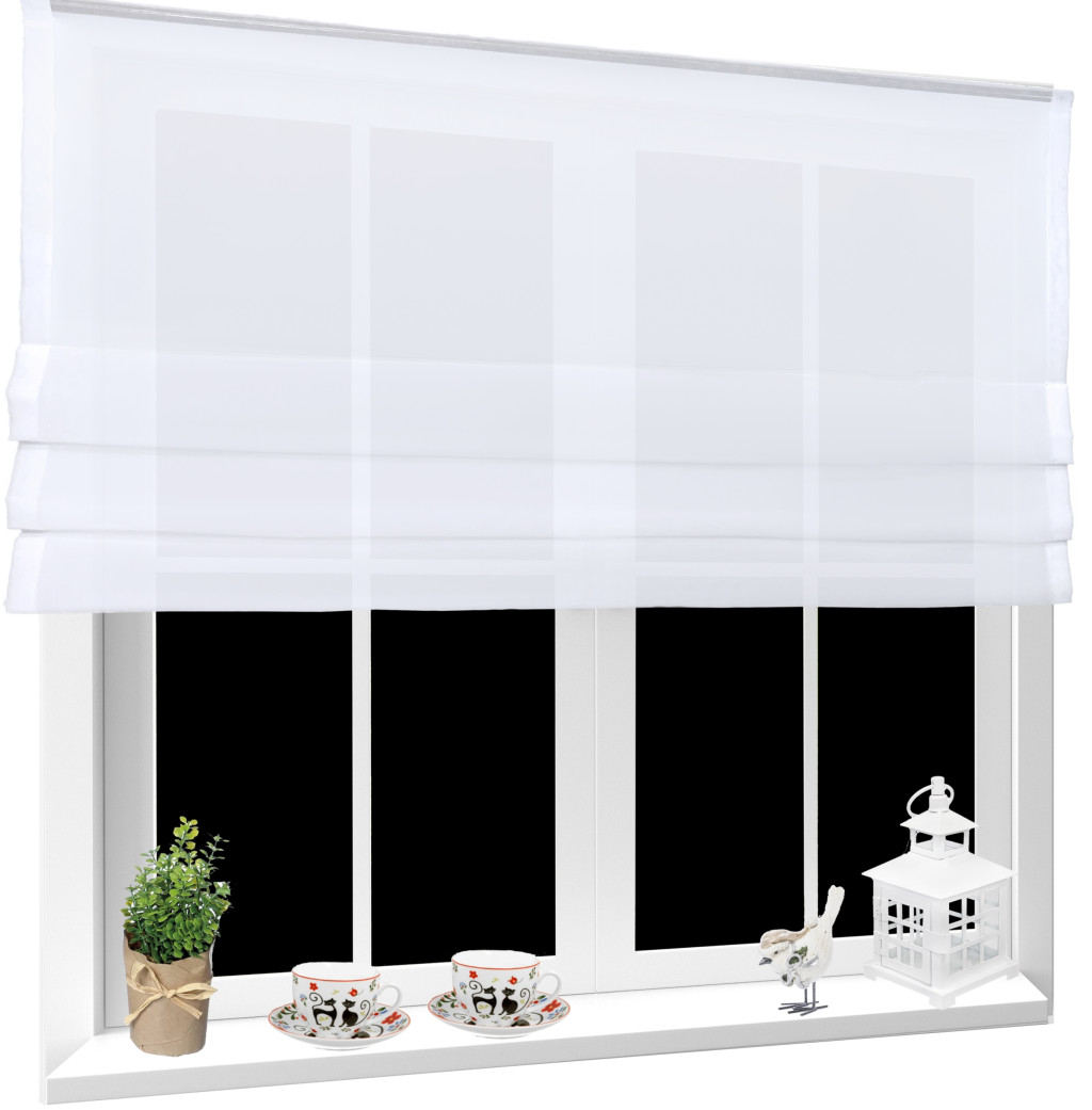 Roletka wykonana z tkaniny w kolorze śnieżnobiałym. U góry wszyta taśma 5 cm. Można przypinać żabkami lub wsuwać na tunel.