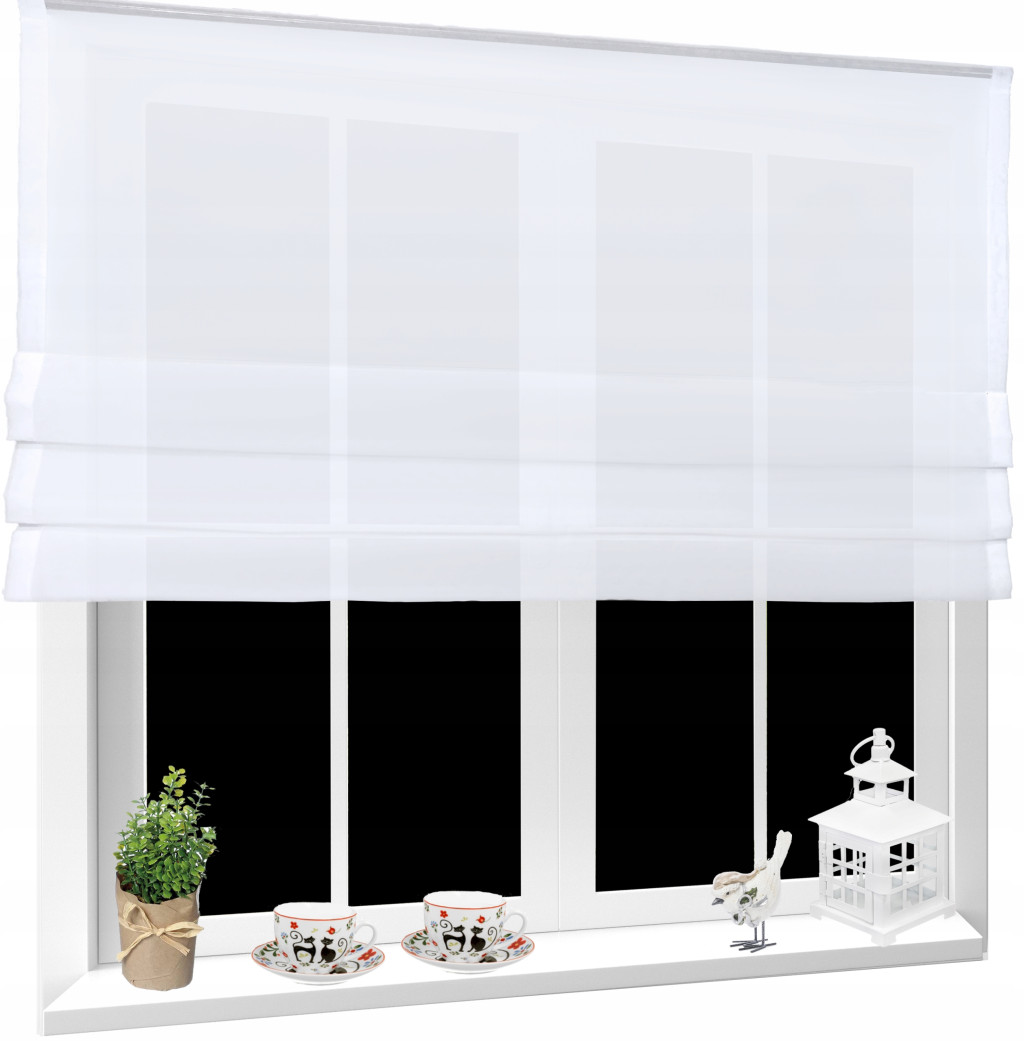 Roletka wykonana z tkaniny w kolorze śnieżnobiałym. U góry wszyta taśma 5 cm. Można przypinać żabkami lub wsuwać na tunel.
