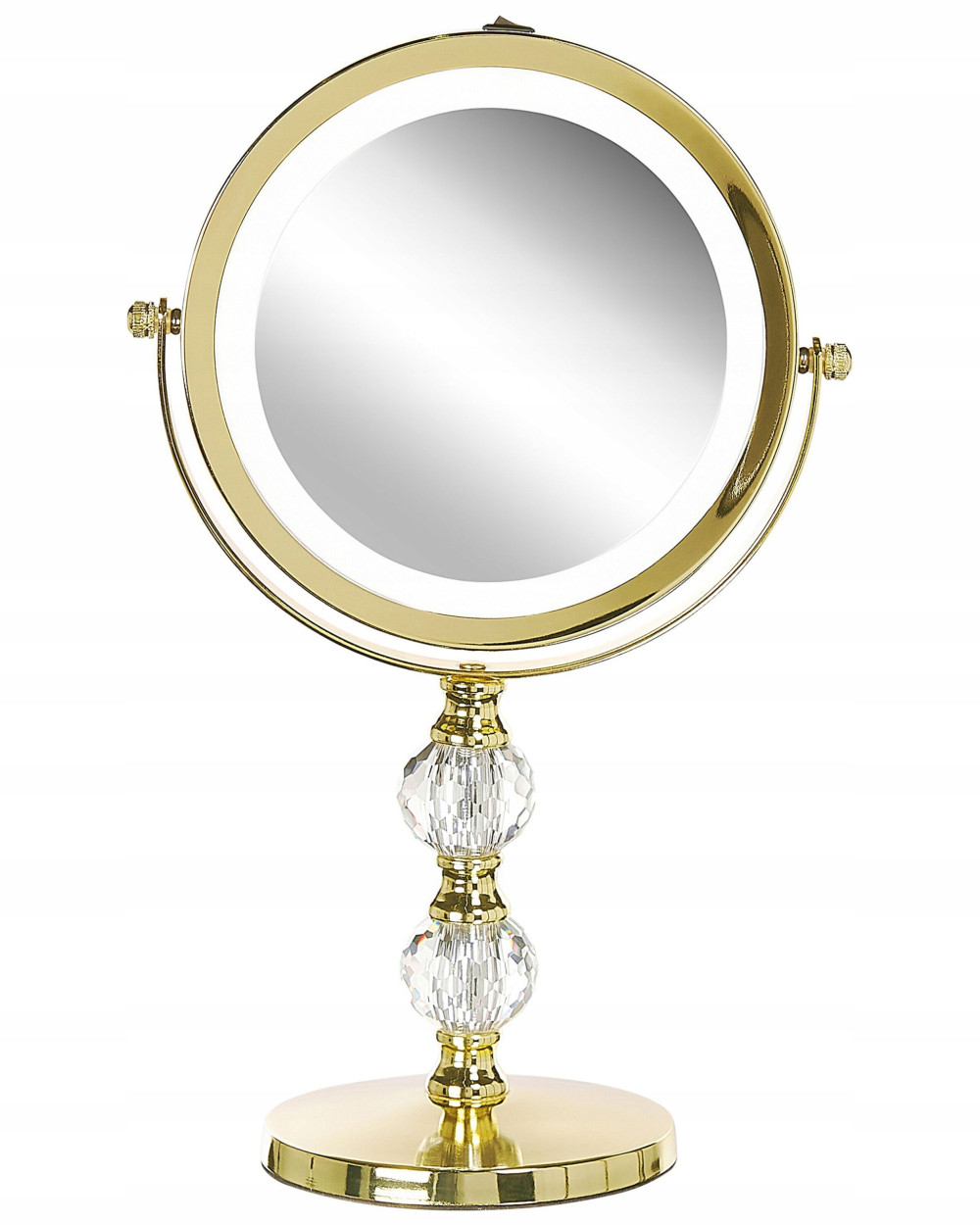 To klasyczne lusterko do makijażu jest doskonałym dodatkiem do każdej toaletki oraz łazienki. Jego ramę wykonano z trwałego żelaza, a nóżkę ozdobiono delikatnym kryształem inspirowanym stylem glamour. Lustro posiada dwie strony, przy czym jedna z nich oferuje aż pięciokrotne odbicie. Co więcej, wbudowane oświetlenie LED znacznie ułatwia aplikację makijażu.
