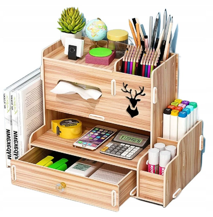 Drewniany organizer na biurko to praktyczny i elegancki sposób na utrzymanie porządku na biurku. Składa się z kilku półek, szuflady i innych przegródek, które umożliwiają przechowywanie różnych przedmiotów, takich jak długopisy, ołówki, nożyczki czy klucze.