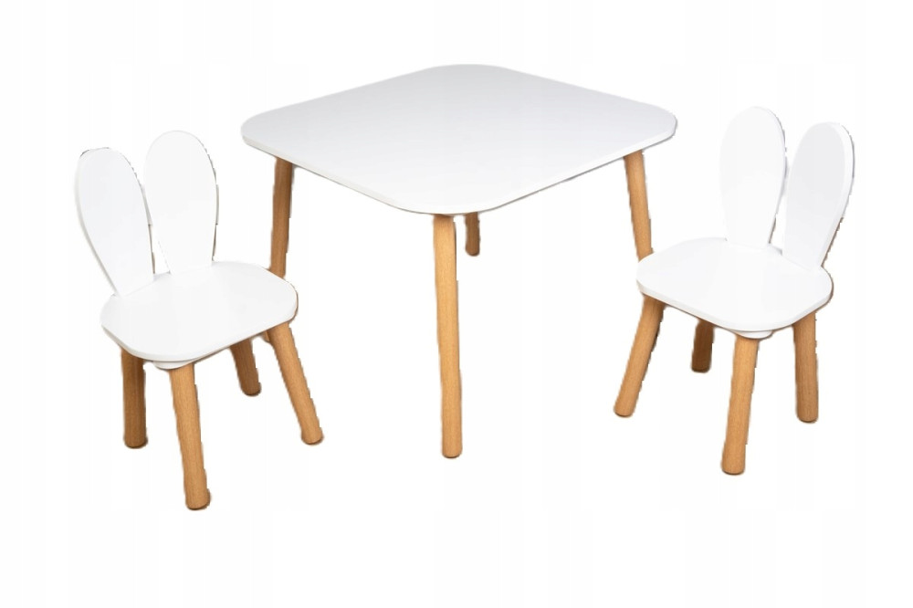 Stolik dziecięcy i 2 krzesła w połączeniu bieli i naturalnego drewna. Pokoje dla chłopców i dziewczynek ożywią oryginalny zestaw mebli. Uszyte krzesełka przypominają króliczki i prezentują się uroczo.