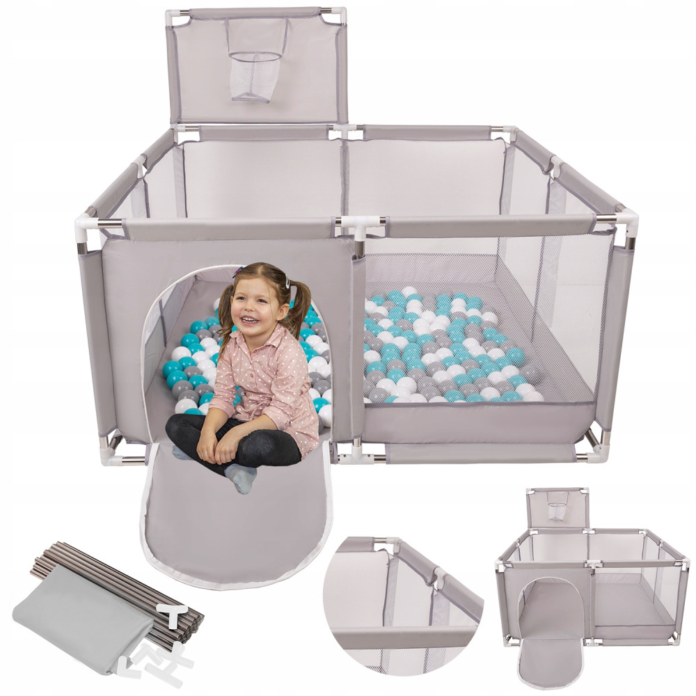 ⭐Składany kojec z plastikowymi piłkami w kształcie mini-boiska zapewni Twojemu dziecku godziny zabawy. Wewnątrz jest wystarczająco dużo przestrzeni, aby w zabawie mogło uczestniczyć swobodnie kilkoro dzieci. Jednocześnie kojec można w łatwy sposób złożyć, dzięki czemu można go schować, lub zabrać ze sobą na wczasy, piknik, czy do znajomych. Jedna ze ścianek jest wyposażona w siatkowy kosz do koszykówki umożliwiając małym dzieciom rywalizację w grze zespołowej.