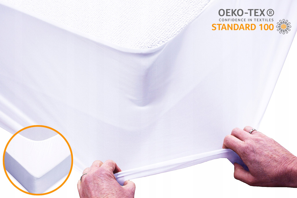 Oferujemy Państwu najwyższej jakości ochraniacze nieprzemakalne na materac z siatką poliestrową i gumką dookoła prześcieradła pasujące na standardowy materac o grubości do 30cm.