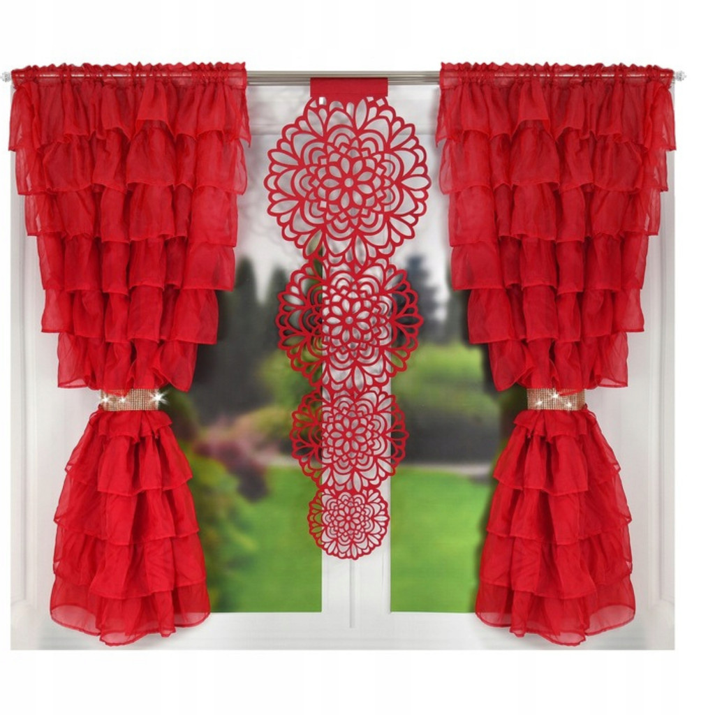 Nasz panel ażurowy to prawdziwe dzieło sztuki wykonane z grubego, sztywnego filcu. Odporny na odkształcenia, ten elegancki element nie tylko skutecznie zasłoni światło, ale także doda charakteru każdemu pomieszczeniu. Jego precyzyjne wykończenie sprawia, że staje się on wyjątkową ozdobą okna, idealną dla tych, którzy cenią sobie klasykę i elegancję.Nasze dwie dekoracyjne firany wykonane z delikatnego woalu to kwintesencja delikatności i uroku. Udekorowane falbankami i dodatkowo podkreślone złotymi tasiemkami, stanowią one niepowtarzalny element wystroju wnętrza.