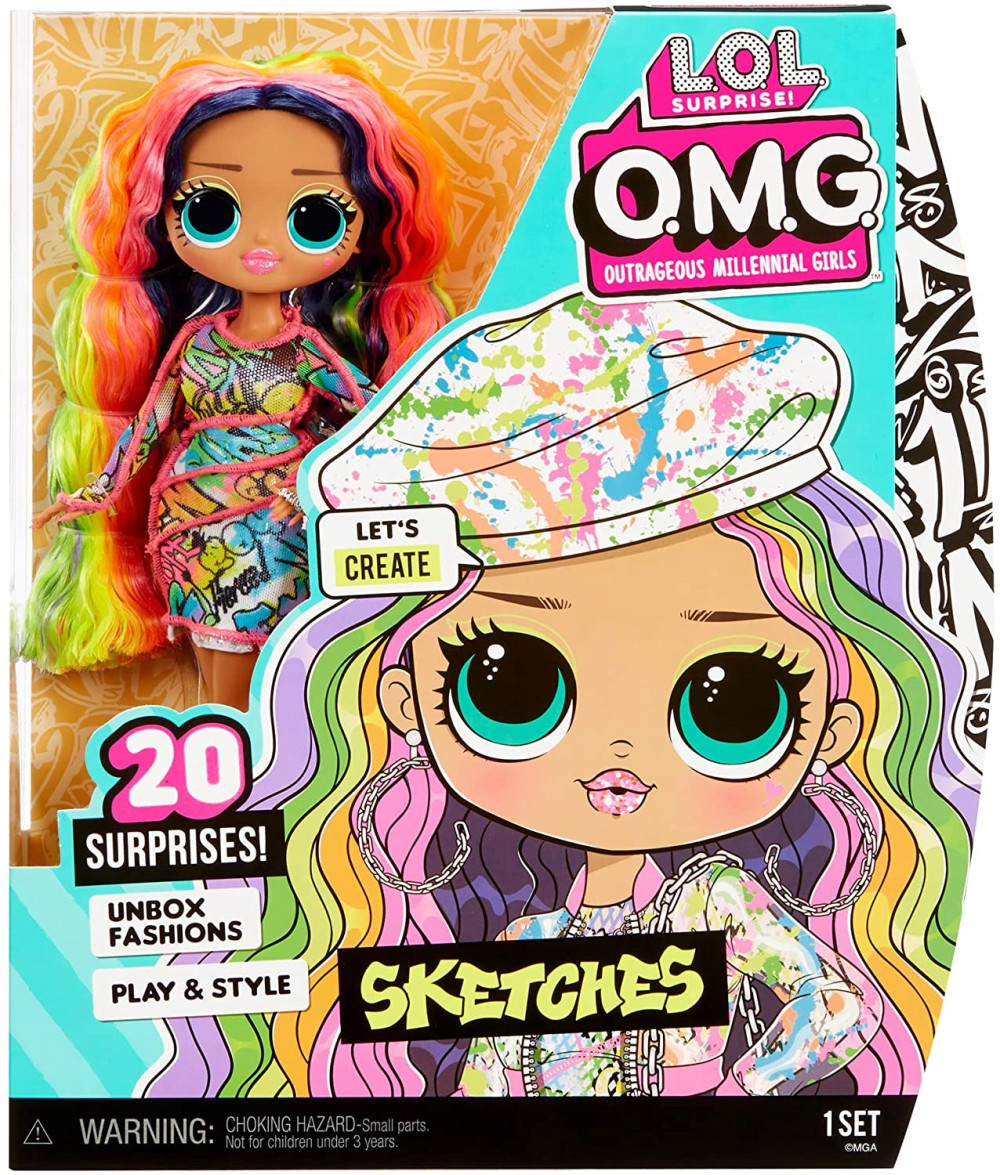 Przedstawiamy zupełnie nową modną lalkę L.O.L. Surprise O.M.G. Sketches z 20 niespodziankami! Sketches to tęczowa dziewczyna, ma oszałamiające rysy twarzy, piękne długie, kolorowe włosy i swój własny tęczowy styl. W zestawie znajdziesz kolczyki, torebkę w kształcie słoika z farbami, tęczowe buty i inne niespodzianki. Najnowsze modne lalki L.O.L. Surprise O.M.G. to nieoczekiwane BFF, celebrujące różnice między przyjaciółmi, które wzajemnie się wzmacniają. Mimo że są inne, kochają to, co kochają i chcą być sobą, bez względu na to, kim jesteś.