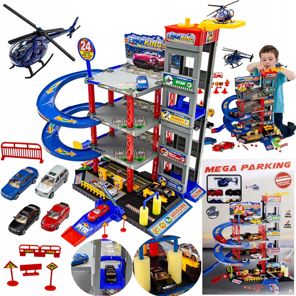 Wielopoziomowy parking samochodowy to super zabawa dla każdego chłopca. Strome zjazdy, ruchoma winda, znaki informacyjne, stacja benzynowa czy myjnia samochodowa są doskonałym uzupełnieniem zestawu. Parking posiada ruchomą windę, zjeżdżalnie, podnośnik, szlabany. pociechy mogą blokować drogę, robić objazdy itp.
