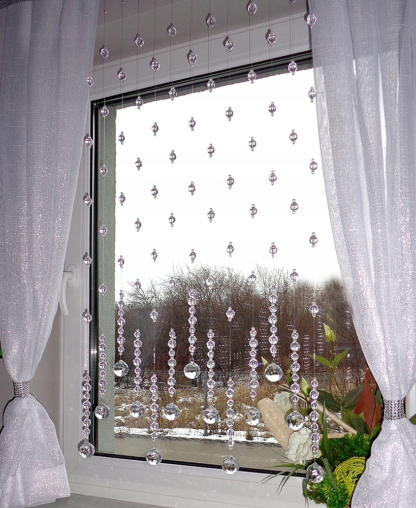 Firana składa się z 13 zawieszek. Najdłuższa zawieszka ma 120 cm, najkrótsza 100 cm. Koraliki nawleczone są na transparentną żyłkę. Na końcu każdej zawieszki wykonana jest pętelka która umożliwia zawieszenie jej na karniszu rurce, na żabce, na kółeczki, agrafce.