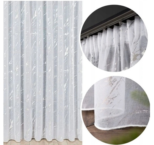 Biała firana wykonana z lekkiej i delikatnej mlecznej tkaniny à la batyst, która ozdobiona jest srebrnym błyszczącym nadrukiem imitującym marmur. Firana wykończona jest estetyczną ołowianką, która dociążą całość i pomaga w jej idealnym ułożeniu na oknie, a boki zostały obszyte. Materiał nie zaciemni wnętrza, ale ograniczy wnikanie do pomieszczenia naturalnych promieni słonecznych. Ten ponadczasowy element aranżacji sprawdzi, się w wielu różnych wnętrzach powodując, że pomieszczenie sprawia wrażenie większego i bardziej przestrzennego. Mieniące się detale w stylu glamour sprawiają, że dodają wnętrzu niezwykłej elegancji, jednocześnie rozjaśniając i ożywiając całe wnętrze.